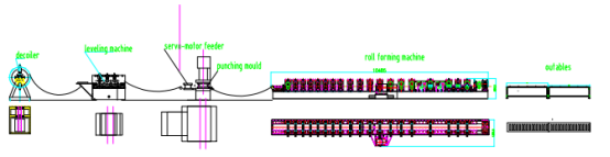Hydraulic de-coiler-Powered leveling –Servo feeding-Hole punching- Forming-Hydraulic cutting-Output table